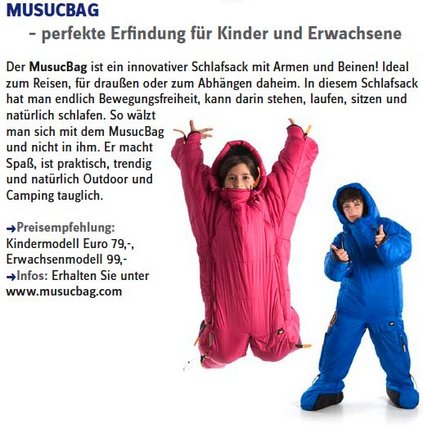 Der Ganzkörperschlafsack ist ein neues Schlaf-System mit der Funktionalität eines herkömmlichen Schlafsacks, der jedoch zusätzlich die Mobilität maximiert, da er Arme und Beine besitzt. Diese ermöglichen es, sich mit dem Schlafsack zu bewegen und nicht nur in ihm. Im Gegensatz zu einem Standard-Schlafsack, in dem man völlig eingedeckt und nicht mobil ist, erlaubt das Design des Ganzkörperschlafsacks einzelne Bewegungen der Arme und Beine, ohne dabei einzuengen. Das Ganze ist natürlich nicht nur praktisch und trendig, sondern auch outdoor- und campingtauglich und sowohl für Kinder als auch für Erwachsene erhältlich.