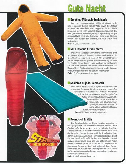 Sarg oder Kokon sind noch die nettesten Namen für Schlafsäcke. Hat man sich erst einmal hineingequält, möchte man die wärmende Hülle vor allem in kalten Nächten nicht so schnell wieder verlassen. Dumm nur, wenn man jetzt Durst bekommt. Mit dem Ganzkörperschlafsack (etwa 100 Euro) wird der Schlafsack nun endlich mobil. Er ist wie ein Overall, in den jeder Arm und jedes Bein extra hineinschlüpfen kann.