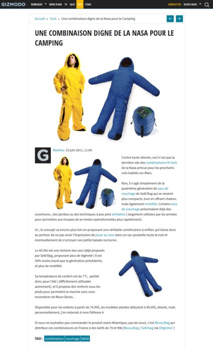 Si vous ne souhaitez pas commander le produit outre-Atlantique, pas de souci, c’est le human-shaped sleeping bag qui distribue ces combinaisons en France à des tarifs de 79 et 99€.